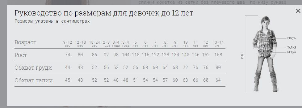 Обратите внимание, что детские размеры по возрасту читаются так: размер 74 подойдет тем, чей рост до 74 см.