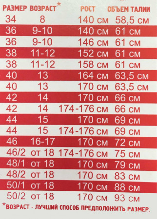 | Возраст | Рост (см) | Грудь (см) Д/М | Талия (см) Д/М | Бедро (см) Д/М | Длина по внутр шву (см) |