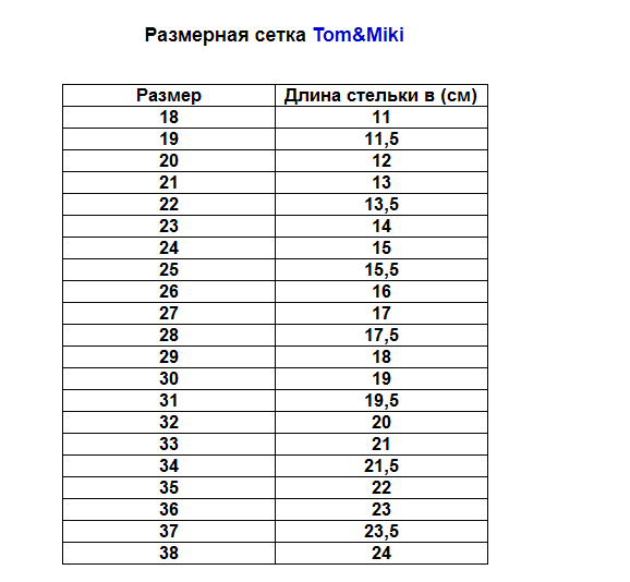 | Размер | 20/21 | 22/23 | 24/25 | 26/27 | 28/29 | 30/31 | 32/33 | 34/35 |