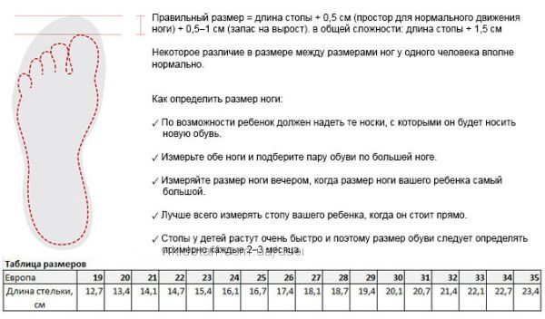 Ведь ребенок ходит и бегает, при движении стопа двигается, поэтому купленные размер в размер ботиночки или туфли окажутся тесными, станут натирать ноги, быстро выйдут из строя.
