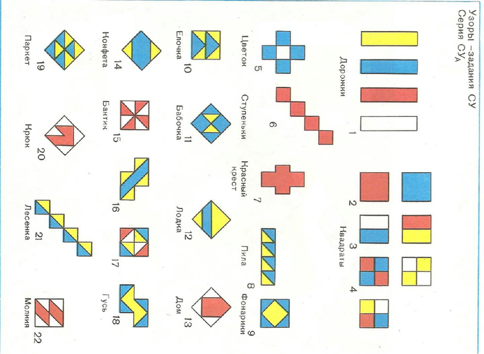 15. Постепенно сложность задания возрастает. Задания из одноцветных кубиков, переходят в задания двуцветные.