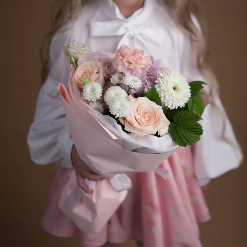 Süßes Mädchen mit Blumenstrauß. Topftulpen в ден Хенден. Frauentagscharakter isoliert auf weißem Hintergrund.