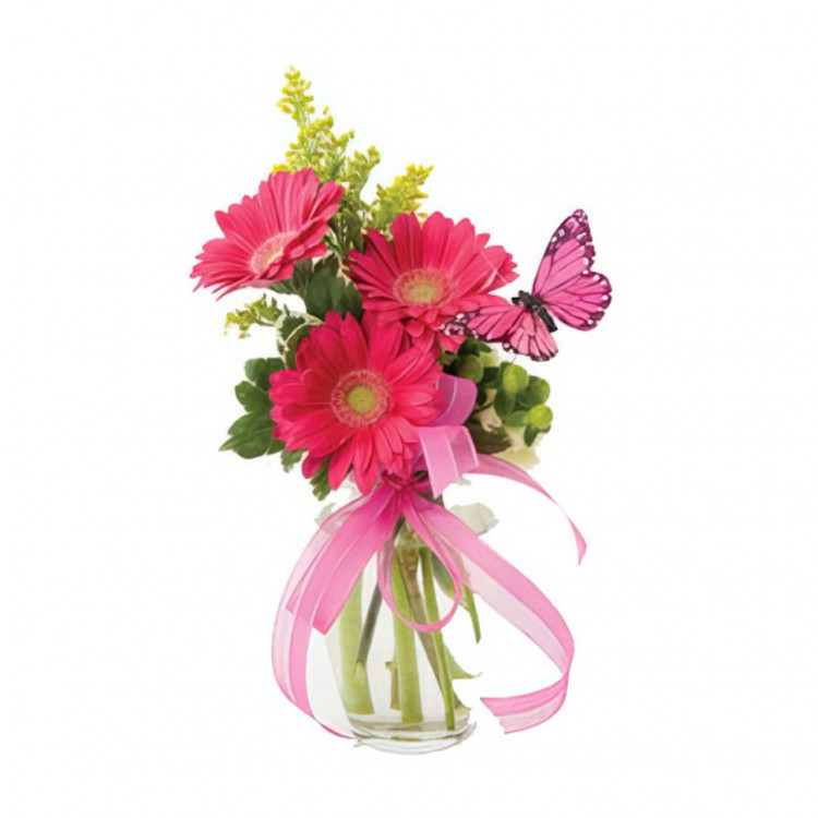 Ein zusammengesetztes Bild von Porträts einer mittelerwachsenen Frau, die Blumen hält und Spaß damit hat, während sie vor einem rosa Hintergrund steht.