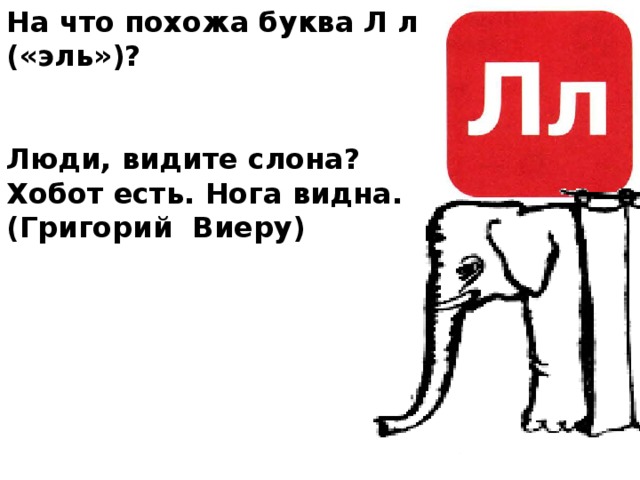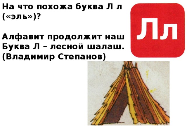 Буква «А» пошла в лесок — Потеряла поясок… Зацепился он за ель: Получилась буква «Эль»! Ландыш, липа, лось, лимон, Лабрадор, летяга, лён! В первой строчке и второй