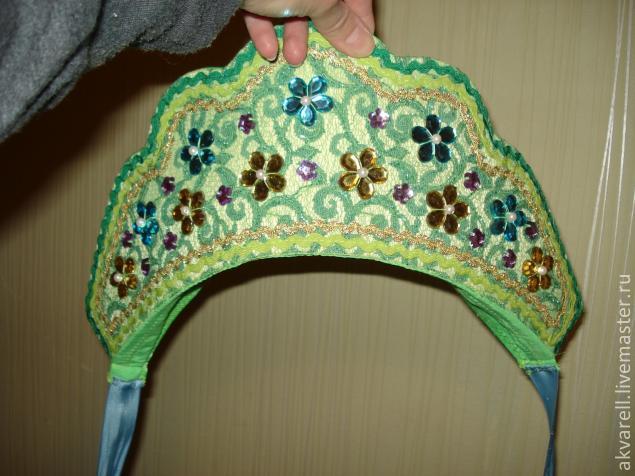 - Пришло время декорировать кокошник. На этом этапе можно использовать любые украшения, ленты и ткани. А также самостоятельно разработать дизайн кокошника.
