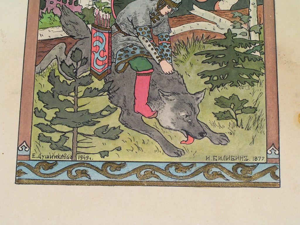Вдруг, откуда бы он ни пришел, волк встал перед Иваном и сказал: «Иван-царевич, сядь на меня, Серый Волк, и пусть прекрасная княгиня сядет на златогривого коня».