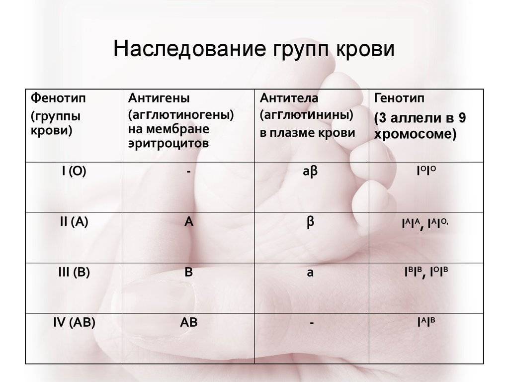 Фенотип А (II) может быть у человека, унаследовавшего от родителей два гена А или гены А и 0. Соответственно фенотип В (III) — при наследовании двух генов В или В и 0. Фенотип 0 (I) проявляется при наследовании двух генов 0. Таким образом, если оба родителя имеют II группу крови (генотипы AА или А0), кто-то из их детей может иметь первую группу (генотип 00). Если у одного из родителей группа крови A (II) с возможным генотипом АА и А0, а у другого B (III) с возможным генотипом BB или В0 — дети могут иметь группы крови 0 (I), А (II), B (III) или АВ (IV).