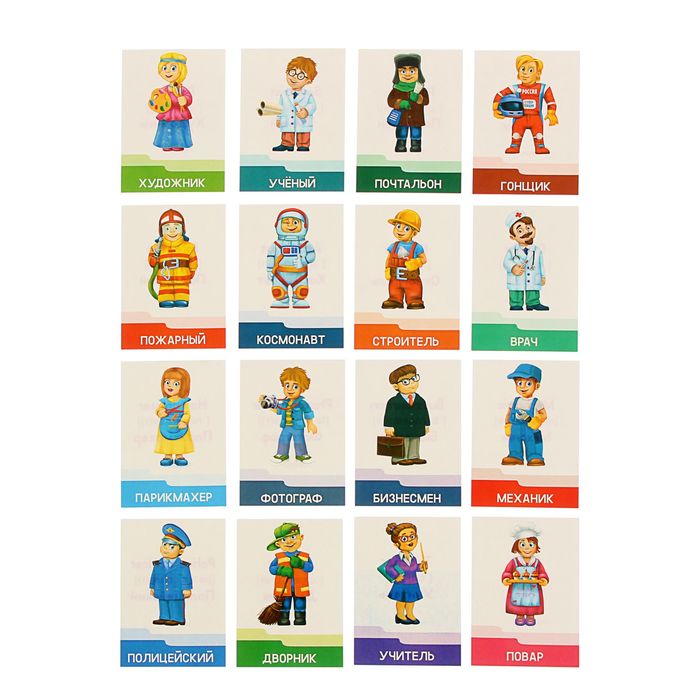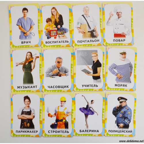 Карточки “Работа” довольно сложные, поэтому я бы рекомендовал эти карточки детям от 5 лет и старше. Обязательно поговорите о том, какие еще работы могут придумать дети. Не стесняйтесь использовать только те карточки, которые соответствуют уровню вашего ученика.