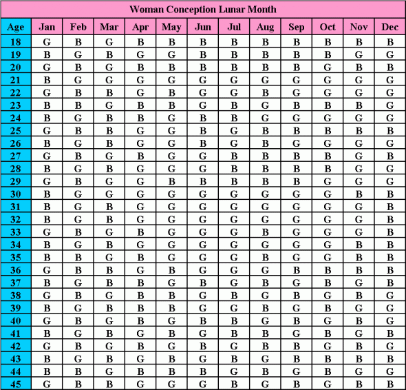 Китайская таблица определения пола ребенка основана на двух учитываемых показателях: возрасте будущей матери и дате (в которой произошло или произойдет) зачатие. Причем возраст матери учитывается в соответствии с китайским лунным календарем, который отличается от общепринятого Григорианского. Для этого необходимо вычислить свой лунный возраст на момент зачатия и только потом сверяться с китайским календарем определения пола ребенка.