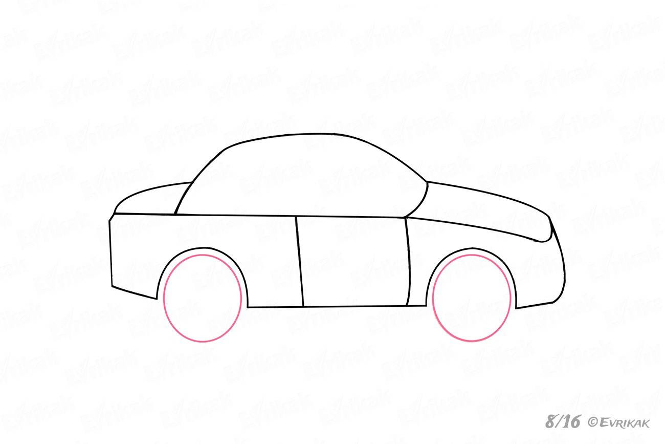 2. Несмотря на то, что у легковой машины 4 колеса мы нарисуем всего два. Почему два? Потому что в профиль видно всего только одна пара передних.