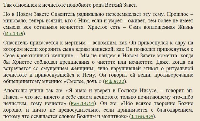 О якобы нечистоте беременных – эта тема прозвучала в одном из ответов. Давайте верить не выжившим из ума бабкам и тем ревнителям христианства, у которых женщина всегда в чм-то виновата и постоянно нечиста, а прислушаться к Св. Ап. Павлу, писавшему в Первом послании Тиофею (2: 14-15), что женщина