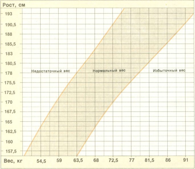 Для оценки веса, подходящего для роста, или для установления долгосрочной цели по снижению веса определяется идеальная масса тела.