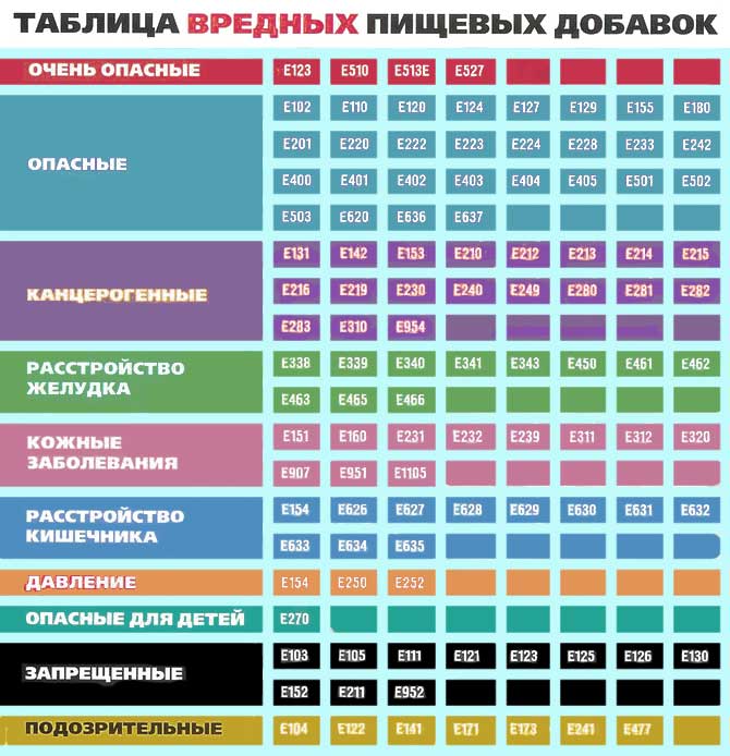 Таблица вредных пищевых добавок (“Е”)