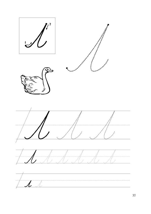 писать первый элемент, начинаем писать второй – палочку с закруглением внизу. Сначала ведем вниз по написанному, а потом следим за тем, чтобы между первым и вторым элементами образовался уголок.