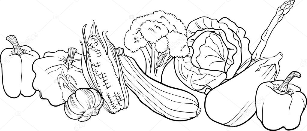 Перец, горох, лук, салат. Раскраска для печати | Зеленая фасоль, баклажаны, огурцы и кукуруза Страница раскраски для печати |