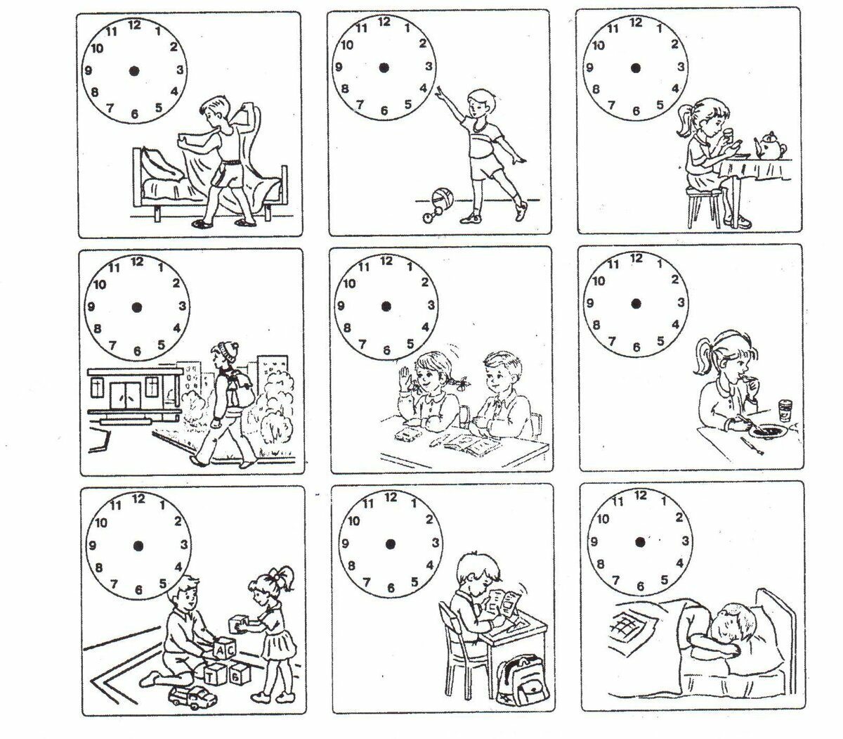 Словарь ежедневных занятий и дополнительные ресурсы: проснуться, умыться, принять душ, высушить волосы, почистить зубы, позавтракать, почистить зубы, одеться, пойти в ванную, заправить постель, пойти в школу, учиться, пообедать, вернуться домой, сделать домашнее задание, поужинать, принять ванну, пойти спать