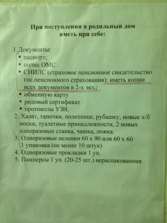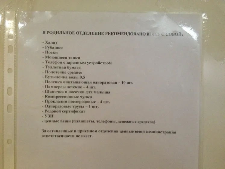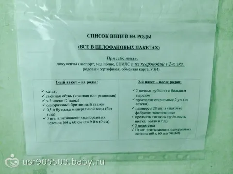 Когда начинаются роды (или вечером перед кесаревым сечением) нужно собрать два пакета. Один передадут родственникам, а второй принесут в палату после родов + пакет на сами роды (на естественные: тапочки моющиеся, мобильный телефон + зарядка, а на кесарево сечение антиварикозные чулки, мобильный телефон, воду 2 литра с крышкой спорт и зарядку)