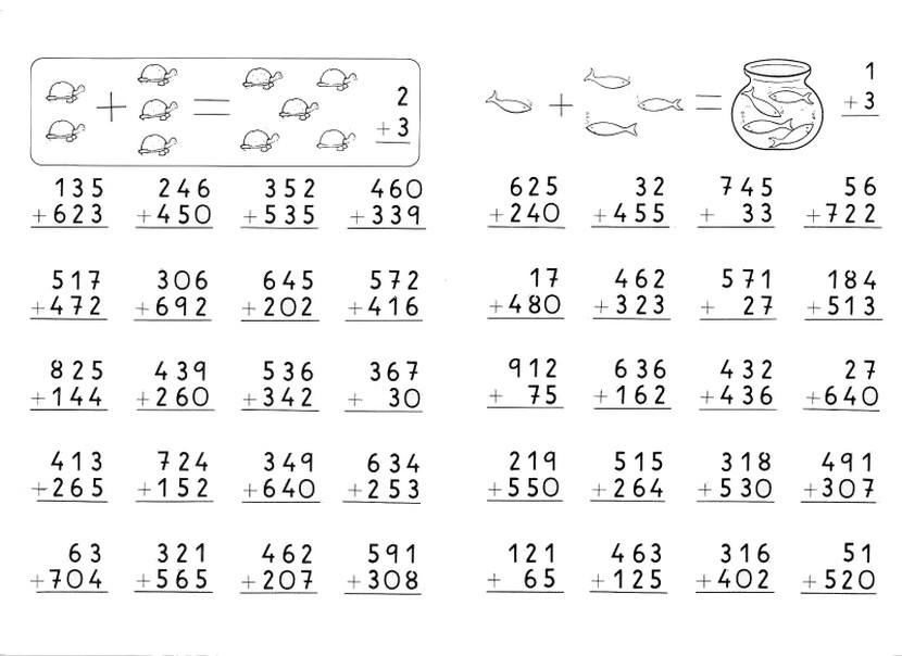 Если ребенок при этом понял, что во втором знаке он складывает десятки, а в третьем – сотни (хотя третьего, наверно, пока нет), это очень поможет ему в тренировке устного счета. Они и считают так устно – складывают отдельно десятки и единицы, а потом – между собой (да и взрослые считают аналогично, просто не задумываются об этом).