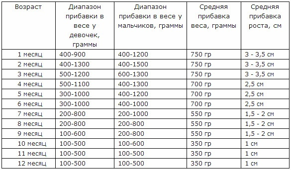 Союз педиатров России предлагает следующие нормы прибавки веса и роста: