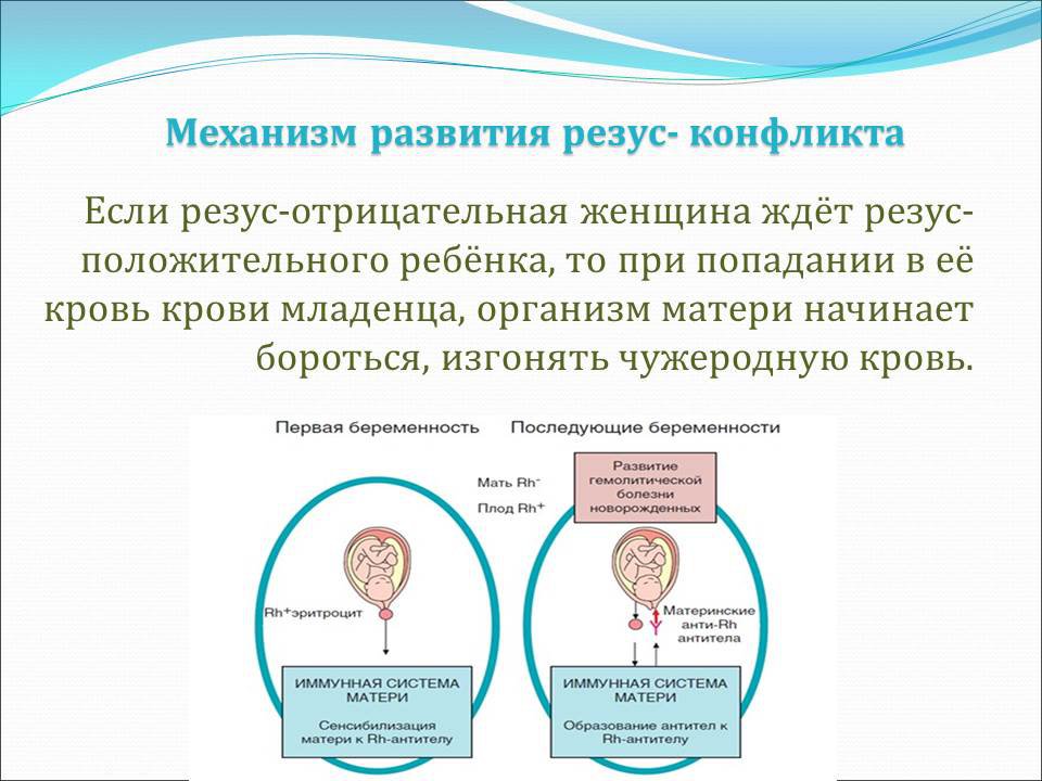 Тех, у кого его нет, называют резус-отрицательными. Когда женщина с отрицательным резус-фактором ждёт резус-положительного ребёнка, в её организме могут вырабатываться специфические антитела. Во время следующей беременности эти антитела проникают через плаценту в кровоток плода и атакуют его эритроциты, что приводит к тяжёлым последствиям.