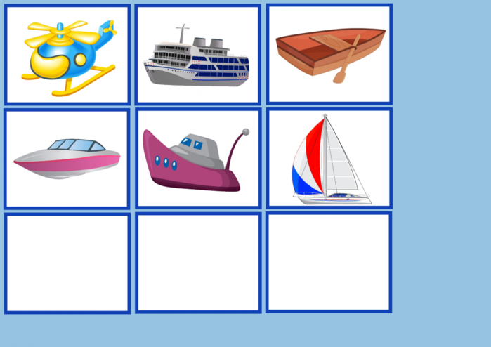 Воспитатель по очереди включает детям запись характерных шумов и сигналов, производимых различными видами транспорта – гудок парохода, гул вертолет, звук работающего автомобильного мотора. После прослушивания фрагмента записи дети должны определить, какому виду транспорта соответствует характерный шум. На экране, дети после каждого отгадывания звука, должны показать картинку, которой соответствует звук.