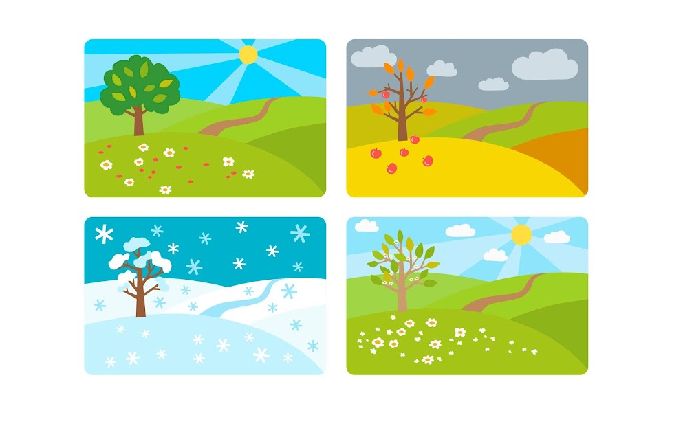 Картинки созданы по сюжетам, взятым из реальной жизни и народных сказок. Разложите перед малышом изображения четырех различных времен года, желательно похожих по сюжету. Например, на всех картинках будет фигурировать человек. Присмотритесь к его одежде, обратите внимание ребенка на то, как одеваются люди летом, зимой, осенью. Спросите, с чем связаны такие изменения. Если на картинках – природа, акцентируйте внимание на том, как «одеты» деревья, какого цвета все вокруг, почему происходят подобные изменения. Пусть в вашей речи чаще звучат названия времен года: малыш будет их запоминать и также начнет употреблять.